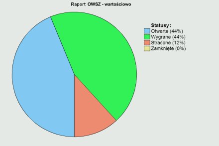 Raport OWS stanowi podsumowanie projektu w podziale na projekty otwarte, wygrane, stracone oraz zamknięte. Użytkownik decyduje o tym, czy raport ma mieć formę tabelaryczną, w którym projekty otwarte, wygrane, stracone i zamknięte przedstawiane są w oddzielnych tabelach, czy też formę graficzną, gdzie informacje przedstawiane są na wykresie kołowym.