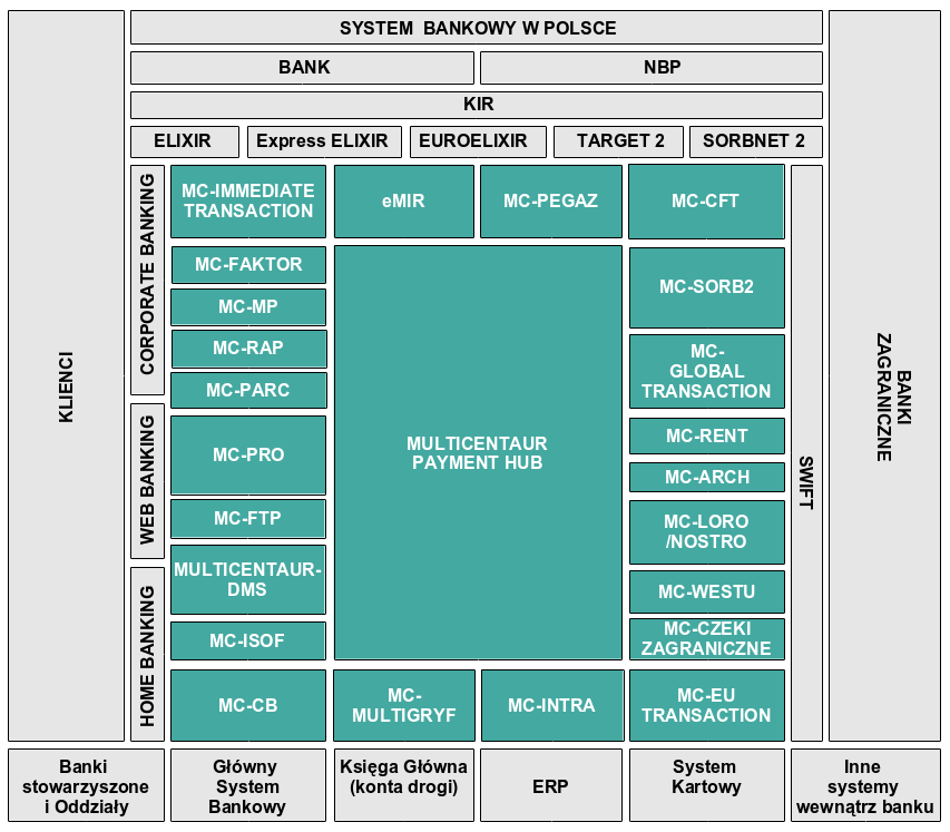 MULTICENTAUR to szereg współpracujących ze sobą modułów, na który składają się: MULTICENTAUR, MC-INTRA, MC-ISOF, MC-FAKTOR, MC-FTP, MC-CB, MC-GLOBAL TRANSACTION, MC-PRO, MC-PARC, MC-RAP, MC-MP, MC-GRYFBANK, MC-PEGAZ, eMIR, MC-CZEKI ZAGRANICZNE, MC-WESTU, MC-LORO/NOSTRO, MC-EU TRANSACTION, MC-CFT, MC-SRB2, MC-RENT, MC-ARCH, MC-WESTU, MC-IMMEDIATE TRANSACTION.